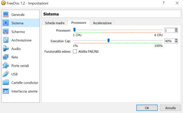 Per far ciò basta aprire VirtualBox, andare sulla voce FreeDos e cliccare la voce "Sistema" sul lato destro. Poi scegliamo "Processore" e abbassiamo l'"Execution Cap" al 40%. Fatto! Siamo pronti per l'installazione di FreeDos...