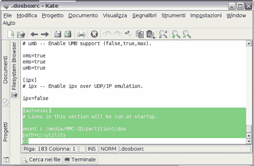 Poi ho creato nella mia directory /home/user un file .dosboxrc contenente il mount per la sd card: