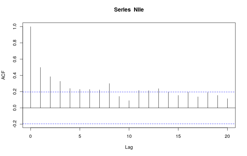 Mostro a mo’ d’esempio l’output della funzione acf() sulla serie storica Nile fornita da R: