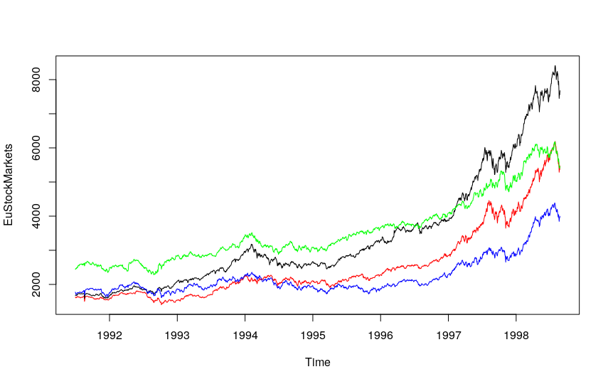 plot.ts(EuStockMarkets, plot.type = "single", col=c("red","black","blue","green"))