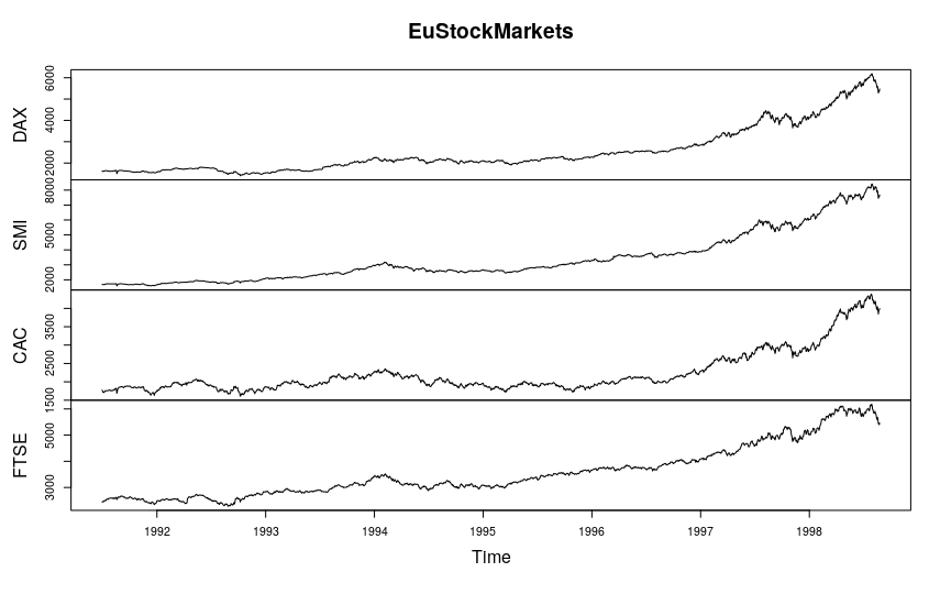 Usiamo un altro dataset di esempio presente in R chiamato EuStockMarkets che contiene, come si può facilmente immaginare, le quotazioni dei listini FTSE, CAC, DAX e SMI :