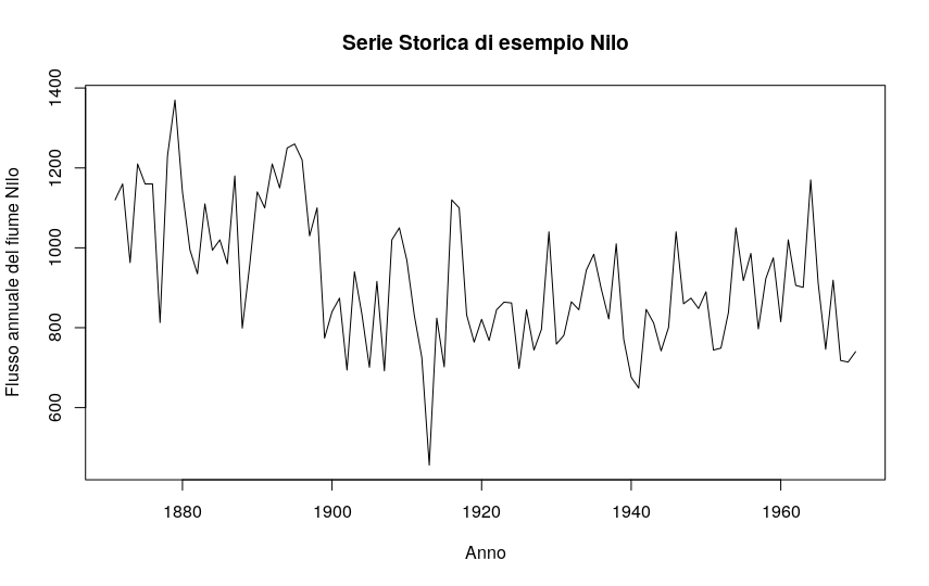 Usando a mo’ d’esempio un dataset compreso in R chiamato Nile contenente 100 letture annuali del fiume Nilo ad Aswan per gli anni dal 1871 al 197 (lo useremo anche nel paragrafo che segue) il comando si presenta così:
