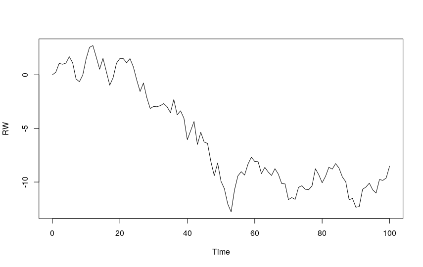 RW <- arima.sim(model = list(order = c(0,1,0)), n = 100) ts.plot(RW)