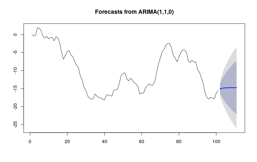 fit <- Arima(simts, order=c(1,1,0)) summary(fit)