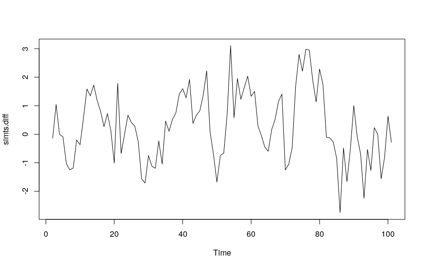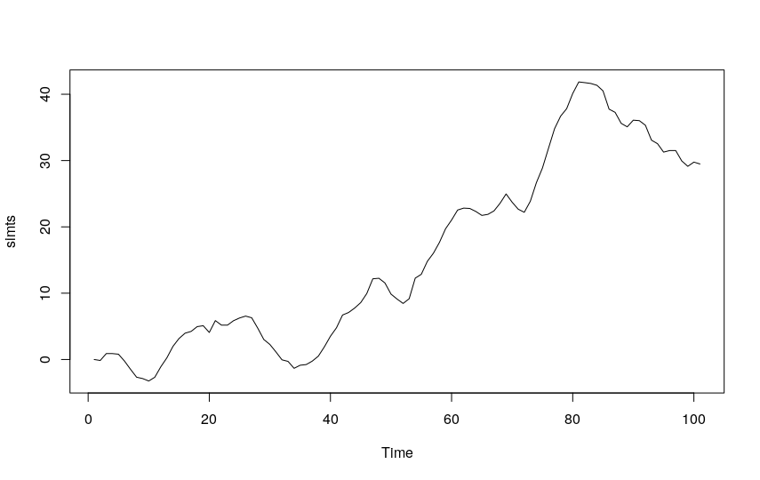 simts <- arima.sim(list(order = c(1,1,0), ar = 0.64), n = 100) plot(simts)