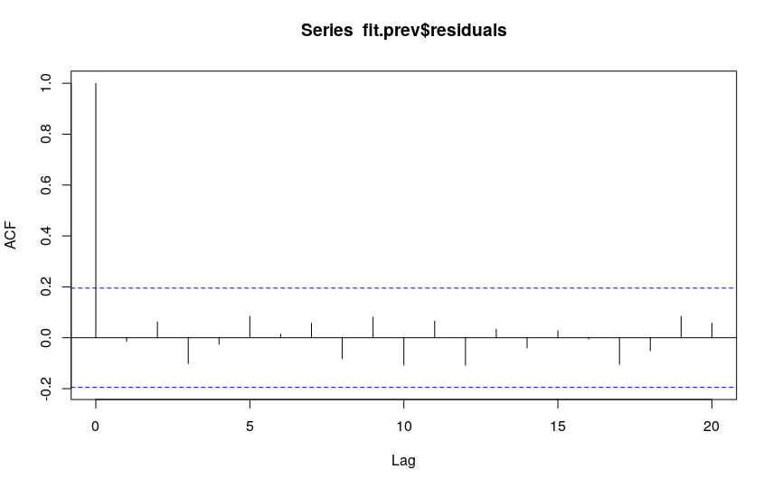 Box.test(fit.prev$residuals) Box-Pierce test data: fit.prev$residuals X-squared = 0.020633, df = 1, p-value = 0.8858