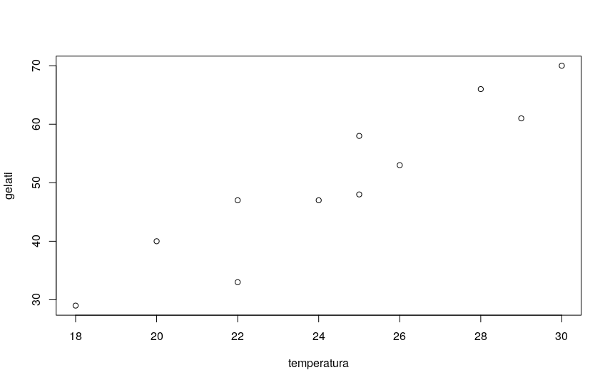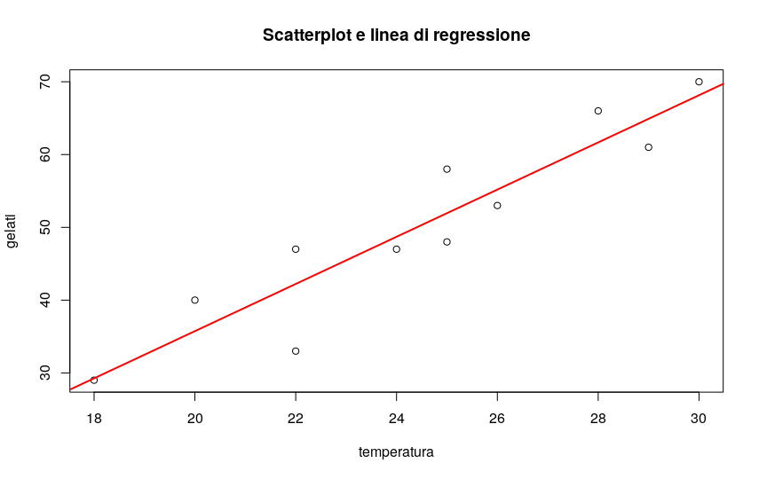 # disegno lo scatterplot plot(gelati$temperatura,gelati$gelati, main="Scatterplot e linea di regressione",xlab="temperatura", ylab="gelati") # e traccio la linea di regressione in rosso abline(lm(gelati$gelati ~ gelati$temperatura),col="red",lwd=2)
