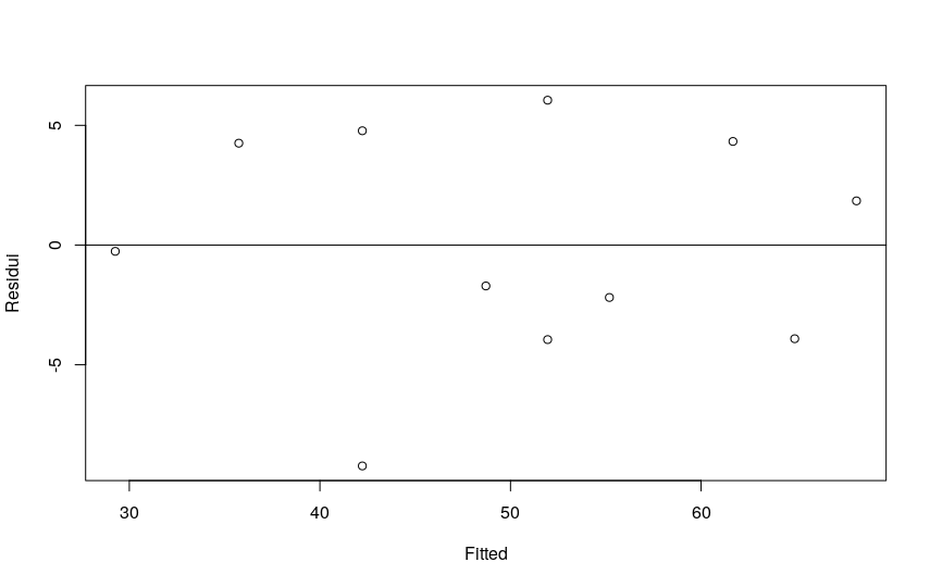 # guardo la distribuzione dei residui. # deve essere bilanciata sopra e sotto la linea di zero. lmgelati <- lm(gelati$gelati ~ gelati$temperatura) plot (lmgelati$residual ~ lmgelati$fitted, ylab="Residui", xlab="Fitted") abline(h=0)