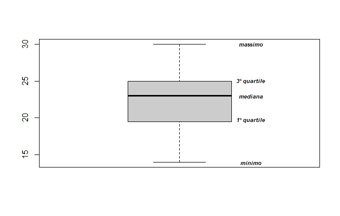 Uso una semplice distribuzione di dati e mostro in R come richiamare la funzione boxplot: