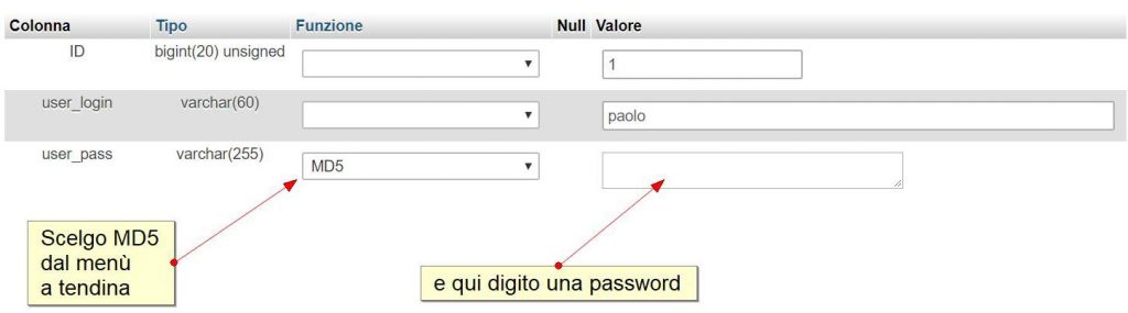 Cancello la vecchia password e scrivo la nuova. Clicco sul menù dropdown alla voce “Funzione” e seleziono la voce MD5.