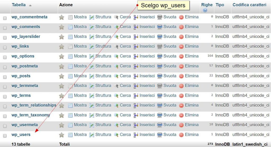 Apro allora phpmyadmin, identifico e seleziono il database che mi interessa, guardo le tabelle e scelgo wp_users (dalla lista sulla sinistra…) cliccandoci sopra.